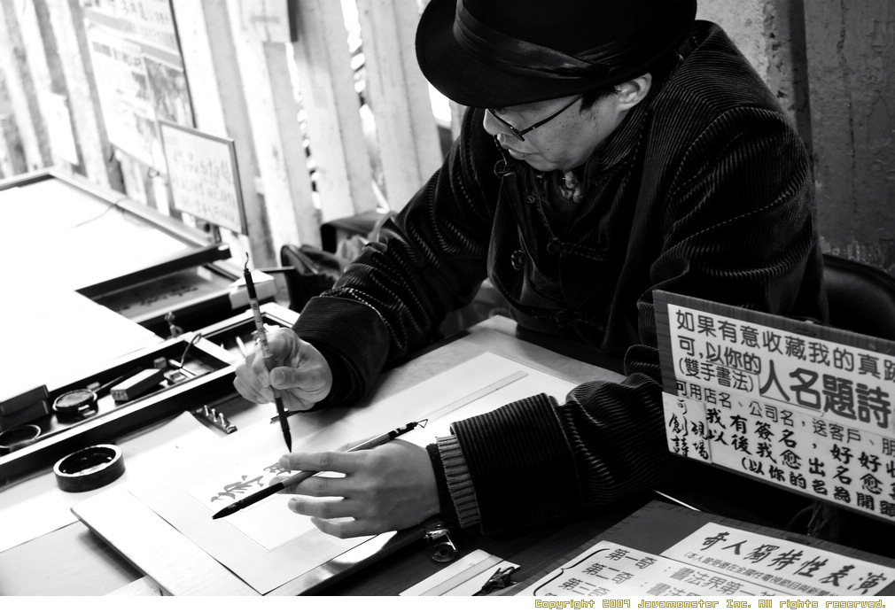 誤解,好像不只我一個人這麼以為那天遇到這位"雙手書法奇人"看他同時執起兩支毛筆以為他要左右手同時寫原來他是右手寫完再換左手寫然後他很敏感的每聽到我的快門聲都看一下鏡頭